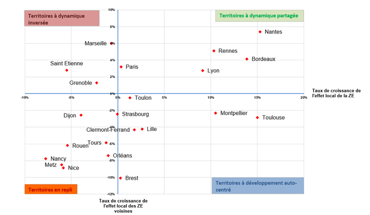 Les quatre cadrans correspondant au positionnement des couples de valeurs correspondent à quatre catégories de métropoles : i) à dynamique partagée, qui correspondent à l’image idéale de la métropole exerçant un effet bénéfique sur les territoires alentours ; ii) à dynamique inversée, qui constituent une sorte d’anti modèle métropolitain ; à développement auto-centré, qui sont performantes sans pour autant entraîner dans leur sillage les territoires voisins et iv) en repli, puisque la métropole centre et les territoires voisins connaissent un effet local de la variation de l’emploi négatif.