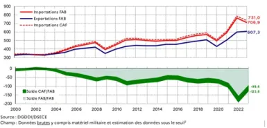 Evolution des échanges et du solde commercial français (en milliards d’euros)