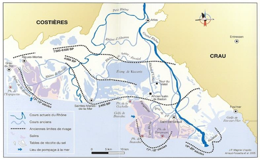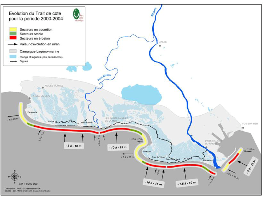 Si entre le 13e et 19e siècles le Rhône s’est avancé vers la mer, aujourd’hui, le delta est fixé mais pas figé. Bien que totalement endigué le delta connaît des changements sous l’effet de phénomènes naturels (subsidence de moins d’1 mm/an) qui se trouvent aggravés par le déficit sédimentaire (environ 10 fois moins de sédiments arrivent à l’embouchure du Rhône comparé à 1850), du fait de la déprise agricole dans le bassin du Rhône, du reboisement des bassins versants et, secondairement, des barrages sur le Rhône et ses affluents. Les conséquences se mesurent en termes d’érosion côtière et de risque de submersion accrus. A ces facteurs viennent s’ajouter aujourd’hui les effets du changement climatique.