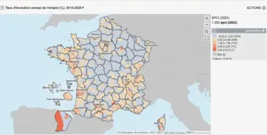 La plupart des intercommunalités qui continuent à enregistrer des créations nettes d’emplois après la crise des subprimes, entre 2009 et 2013, s’inscrivent dans ce « U ». C’est également le cas lors de la période suivante, jusqu’à la crise covid (entre 2014 et 2020). En revanche, plus de la moitié des territoires intercommunaux accusent des soldes nets négatifs sur ces périodes de vaches maigres et subissent une dévitalisation économique à feu lent. C’est ce que met en évidence la carte ci-dessous, réalisée à partir de l’Observatoire des territoires de l’ANCT.