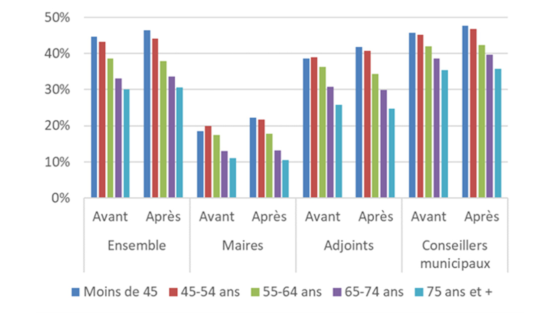 Les femmes élues dans les conseils municipaux sont par ailleurs dans l’ensemble plus jeunes que leurs homologues masculins, notamment parce que l’engagement dans les conseils municipaux semble connaître un regain chez les hommes au moment du départ à la retraite, alors que rien de tel ne s’observe chez les femmes.