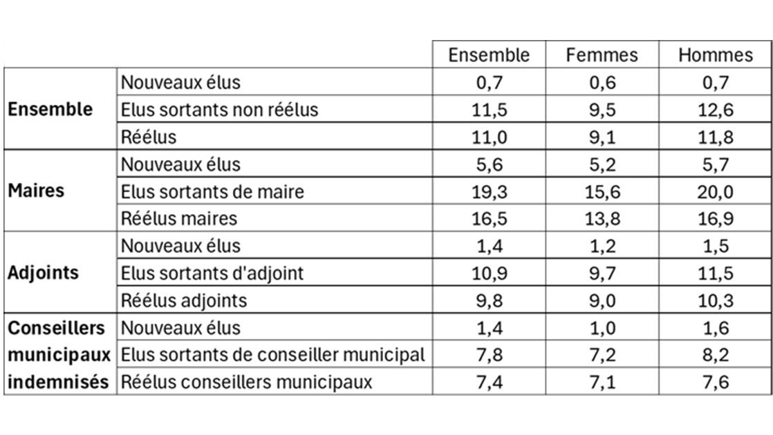 En outre, les femmes élues dans les conseils municipaux sont moins souvent reconduites que les hommes lors du scrutin de 2020 (sans que les données permettent de dire si elles se représentent moins souvent que les hommes ou si elles sont plus souvent battues lorsqu’elles se représentent). Pour autant, la part des femmes dans les conseils municipaux augmente de 2,3 points au moment des élections de 2020 car elles sont beaucoup plus nombreuses parmi les nouveaux élus que parmi les élus non reconduits ; en particulier leur part parmi les maires augmente de plus de 2 points (tableau 2).