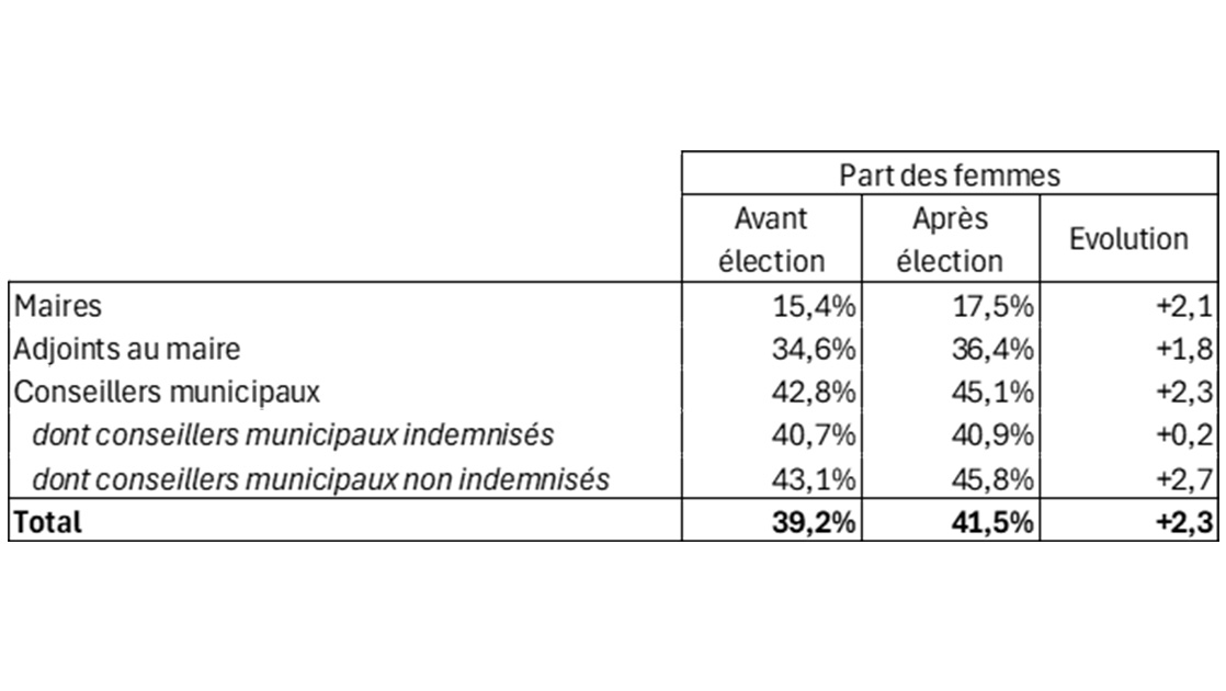 La part des femmes dans les conseils municipaux élus en 2020 s’établit à 41,5 %, avec toutefois des écarts très marqués selon que l’on considère les maires (17,5 %), les adjoints (36,4 %) ou les conseillers municipaux (40,9 % chez les conseillers indemnisés et 45,8 % chez les conseillers non indemnisés).