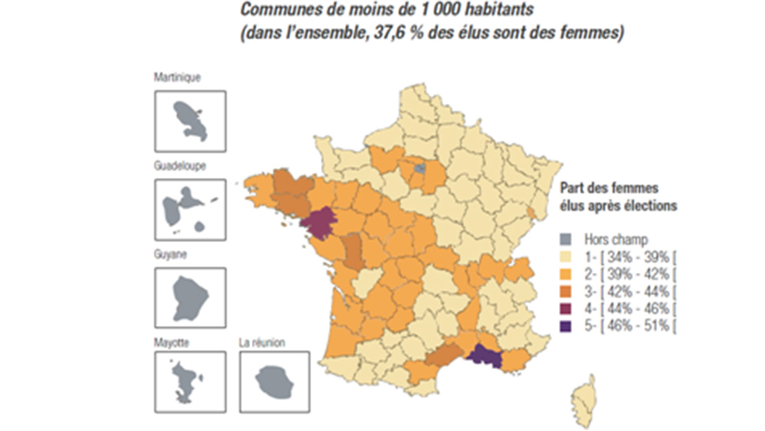 Assez logiquement, la part des femmes est plus faible dans les conseils des communes de moins de 1 000 habitants, pour lesquelles aucune obligation de parité ne s’applique : elle atteint néanmoins 37,6 % dans ces communes. On observe par ailleurs des singularités géographiques : la part des femmes dans les conseils des communes de moins de 1 000 habitants est dans l’ensemble plus élevée dans les départements des régions Bretagne, Pays de la Loire, Centre Val de Loire, Nouvelle-Aquitaine et Île-de-France, ainsi que dans la vallée du Rhône et sur une grande partie du littoral méditerranéen (graphique 1).
