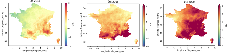 La raison de ce choix, c’est qu’une moyenne effacerait les extrêmes qui entraînent pourtant des conséquences beaucoup plus dramatiques pour les biens et les personnes, qu’une hausse moyenne de température, de précipitation, etc… Pour illustrer nos propos, notons que les anomalies dans la fréquence des températures maximales extrêmes changent par région en France, entre l’été 2011, l’été 2016 et l’été 2020.