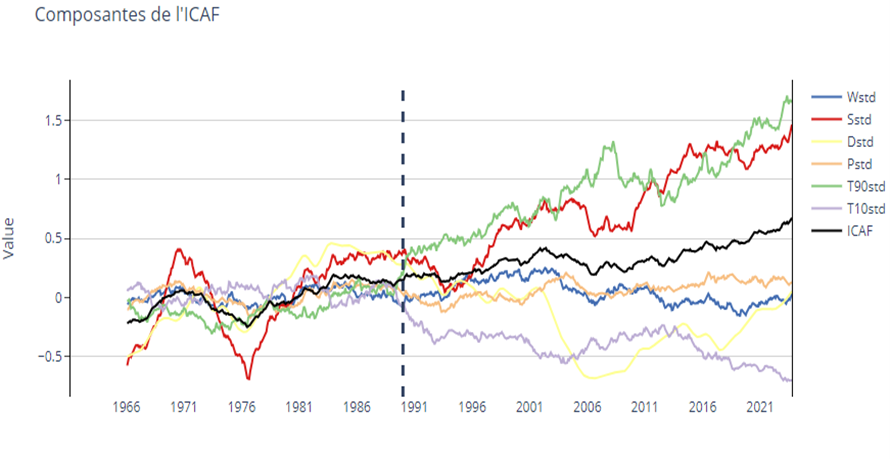 Chaque composante est ensuite standardisée (les pics de froids sont inversés en raison du réchauffement climatique qui réduit progressivement leur occurrence). L’indice est ensuite simplement la moyenne de ces composantes :