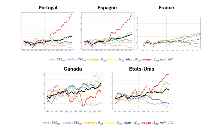 Hormis le Canada, le changement du niveau de la mer est dominant dans tous les graphiques (courbe rouge). Les quatre autres pays montrent des tendances similaires, en termes de croissance ou de date de début des phénomènes (vers le milieu des années 90). Le Portugal et l’Espagne ont connu les plus fortes augmentations, avec une anomalie maintenant à plus de 4,5 écarts-types par rapport à sa moyenne de 0. Aux États-Unis, il se situe actuellement à un niveau d’environ 3,5, et en France autour de 1,5. L’anomalie du niveau de la mer au Canada a connu une forte baisse cyclique à la fin des années 1990, et n’a jamais rattrapé les États-Unis depuis. Notez que les changements océaniques et du niveau de la mer dépendent de la région, à l’intérieur de ces pays. La littérature souligne également des cycles à plus long terme dans les variations du niveau de la mer, qui ne sont pas captés par les périodes de référence de 30 ans comme celle de l’ACI (voir Pineau-Guillou et al., 2021). De plus, il n’est pas clair comment les changements dans les océans et les niveaux de la mer affectent le climat des régions intérieures. Pour toutes ces raisons, il est difficile de tirer des conclusions générales sur les tendances, autre que la signification du changement dans la variable niveau de la mer standardisée après la période de référence, et le fait que les eaux côtières plus froides du Canada semblent subir un impact moindre que dans les quatre autres pays.