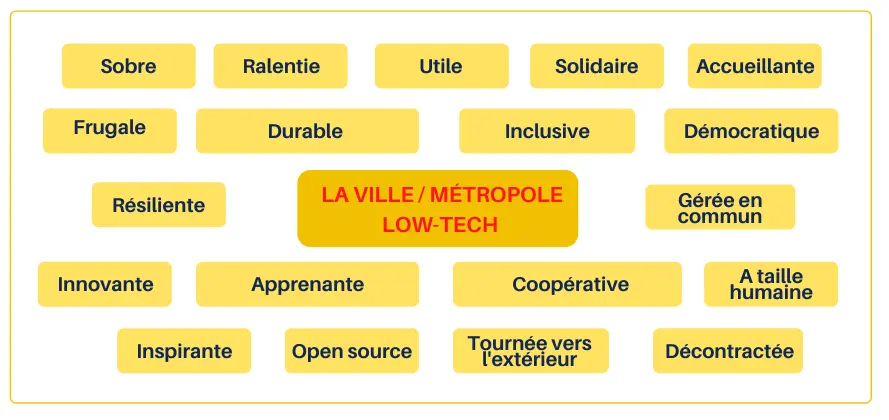 L’étude « Pour des métropoles low-tech et solidaires » du Labo de l’ESS, présidée par Philippe Bihouix[5], s’est appuyée sur la définition de la low-tech proposée précédemment pour tenter de comprendre ce que serait une ville ou une métropole pleinement low-tech. Quatre principaux qualificatifs sont ressortis de cette réflexion. La ville low-tech est un territoire durable, c’est-à-dire dont le fonctionnement et ses impacts locaux et globaux sont écologiquement soutenables.