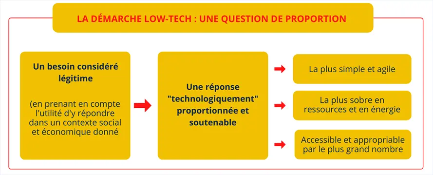 Face à ces constats, la notion de low-tech n’invite pas à se couper de toute technologie ni de toute innovation, y compris high tech. Elle invite simplement à chercher une juste mesure dans notre mobilisation des technologies, d’une part en s’interrogeant sérieusement sur nos besoins afin de se recentrer sur ce qui nous est réellement utile dans un contexte de surexploitation des ressources planétaires et d’inégalités sociales croissantes ; d’autre part en privilégiant, pour y répondre, des solutions les plus simples et agiles possibles, sobres en ressources et en énergie et qui soient accessibles et appropriables par le plus grand nombre.