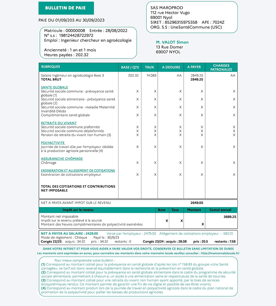 Une fiche de paie sur laquelle apparaissent des contributions au financement d’une sécurité sociale de l’alimentation, d’une retraite pour animaux et d’un système de polyactivité.