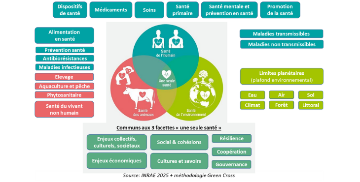 Les institutions scientifiques ont également contribué à poser et relayer ce cadre, notamment dans la continuité des Objectifs de Développement Durable et des Limites Planétaires. En France, l’INRAE et le CIRAD ont publié en 2021 le rapport « Une seule santé : l’interdépendance des santés humaine, animale et des écosystèmes »[9].