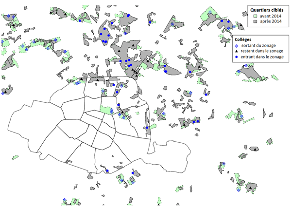 Depuis le milieu des années 1990, la mise en œuvre de la politique de la ville repose sur le repérage et la délimitation des quartiers urbains susceptibles de bénéficier des subsides publics, selon un principe de discrimination territoriale positive visant à concentrer plus de moyens financiers sur les zones les plus défavorisées. Si le périmètre des quartiers bénéficiant de la politique est resté stable au cours des premières décennies d’implémentation de la politique, la réforme « Lamy » (du nom de l’ancien Ministre délégué à la ville) a redessiné en profondeur les contours des zones ciblées en 2014. La construction du nouveau zonage a été opérée sur la base d’un carroyage très fin (200m x 200m) du territoire français, et par l’amalgame des carreaux contigus caractérisés par un revenu médian inférieur à un seuil de pauvreté prédéfini par les pouvoirs publics – seuil fixé à 60 % d’une moyenne pondérée du revenu médian national et du revenu médian de l’unité urbaine englobant chaque carreau. Les zones amalgamées disposant d’un revenu médian supérieur au seuil de pauvreté, mais qui bénéficiaient de la politique de la ville avant 2014, sont sorties du dispositif. À l’inverse, les zones situées au-dessous du seuil de pauvreté, mais qui n’étaient pas éligibles avant 2014, le sont devenues. Ainsi, à carte scolaire inchangée, les élèves des établissements scolaires situés dans les nouveaux « quartiers prioritaires » sont « entrés » dans le giron de la politique de la ville, tandis que les élèves des établissements situés dans les zones disqualifiées en sont « sortis ». La figure 1 illustre les changements de statut occasionnés par la réforme « Lamy » pour les collèges de la région parisienne.