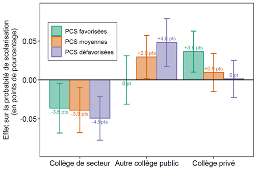 Lecture : La labélisation en « quartier prioritaire de la ville » a augmenté de 3,6 points de pourcentage la propension des familles issues de catégories socio-professionnelles (PCS) favorisées à inscrire leur enfant dans un collège privé. Bien qu’aucun surcroît d’évitement vers le privé ne soit observé pour les PCS défavorisées, ces dernières se sont davantage reportées sur les autres collèges publics (+4,8 points de pourcentage).