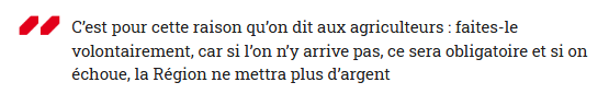 Ce qui fait également l’originalité du programme Re-Sources, c’est la possibilité que le cadre réglementaire puisse s’imposer, une fois constaté l’échec du cadre volontaire. Activé par l’État (par le biais de la Région) il est mis en branle lorsque le comité technique en charge de l’évaluation des programmes constate l’échec des mesures volontaires engagées sur une zone d’alimentation du captage. Il en informe alors le COPIL local qui, à son tour en informe le COPIL régional dont on a vu plus haut, qu’il inclut les représentants des plus hautes instances décisionnelles. A ce titre, Re-sources représente la dernière chance pour les exploitants de mobiliser des fonds pour atteindre les résultats attendus.