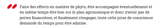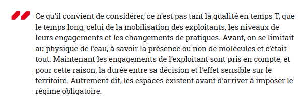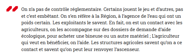 Or pas plus que les interlocuteurs des syndicats de bassin cités précédemment (voir la note Un acteur local décisif : les syndicats de rivière), ceux du programme Re-Sources n’affichent de satisfaction face à des résultats qui tardent à être enregistrés. En rendent compte les réticences profondes de la profession agricole à modifier ses pratiques mais aussi les décisions adoptées sans concertation aucune sur la levée des interdictions pesant sur les pesticides qui ruinent leurs efforts.