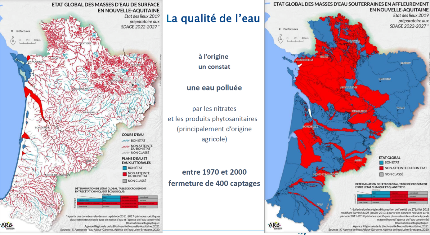 La qualité de l’eau n’est pas bonne dans la partie nord de Nouvelle-Aquitaine car si à l’échelle du bassin Adour-Garonne, elle se situe à 55%, au niveau de la Charente ce niveau s’abaisse à 22%. Les causes sont de deux ordres. En premier lieu, la présence de pesticides et de nitrates qui ont contribué à la dégradation de 243 captages. Parmi eux, 79 sont des captages prioritaires – ce sont ceux sur lesquels Re-sources intervient - les 164 autres captages sont dits « sensibles ».