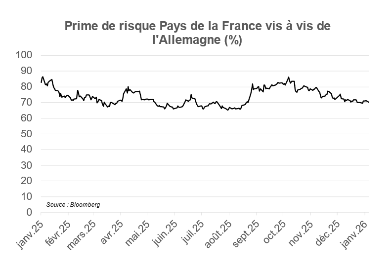 --> Perspectives 2026 : en cas de « clarification » de la situation, la prime de la France aurait un potentiel de reflux de 20 pb environ… mais la prime de risque restera en 2026 soumise à un paysage politique fragmenté qui rend le redressement des comptes publics et les réformes structurelles difficiles. La prime de risque pays ne sera donc vraisemblablement pas un facteur baissier-taux long en 2026.