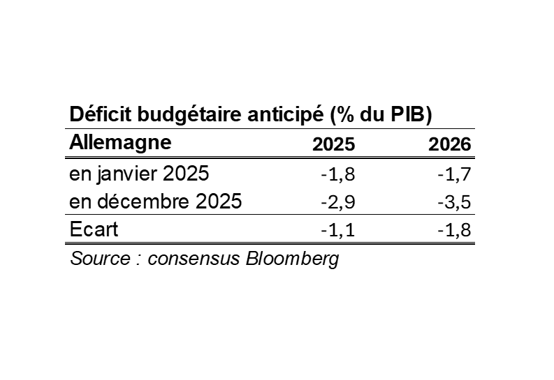 - Côté Allemagne, la dette référente de la zone euro, il n’y a pas eu de dégradation mais les réformes politiques (frein de l’endettement levé, hausse des dépenses militaires…) ont redessiné les anticipations de déficits budgétaires : le volume des émissions à absorber par les investisseurs sera plus ample et cette configuration de demande de financement se traduit par une hausse des taux pour attirer les capitaux.