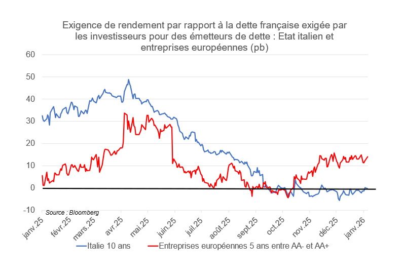 Une lecture avec d’autres référents (dette privée, dette souveraine italienne) donne une vue plus juste de la dégradation relative de la qualité de la signature souveraine française : il n’y a plus de rendement supplémentaire par rapport à la dette française sur la dette souveraine italienne et les entreprises européennes se financent à un taux comparable.