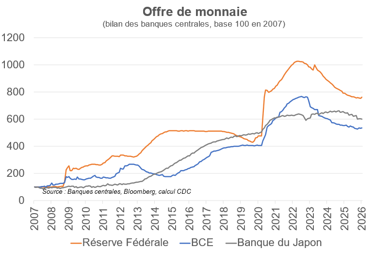 Pendant une grande partie de 2025, les banques centrales ont continué de normaliser et réduire leur bilan par des ventes d’actifs obligataires souverains (le « quantitative tightening », QT), ce qui a participé à faire baisser les prix des obligations donc à augmenter les taux longs. En fin d’année, la Réserve fédérale américaine a décidé de stopper ses ventes d’obligations, ce qui vise à aboutir à un taux d’équilibre contenu.