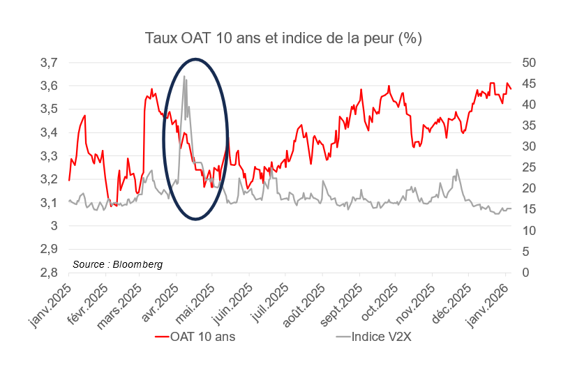 En 2025, ce phénomène a été ponctuellement observé, notamment lorsque D. Trump a jeté un voile d’incertitude sur le degré de dureté de sa politique commerciale au printemps. Dans le reste de l’année, la volatilité des marchés actions (« indice de la peur ») n’a pas évolué sensiblement.