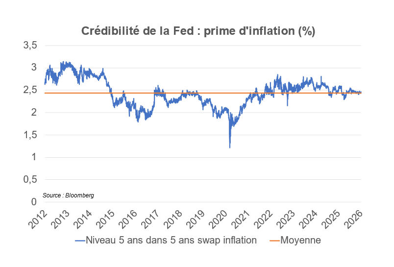 Une série d’indicateurs peut être sollicitée pour évaluer ce risque, en sus des facteurs habituels (taux de change, flux de capitaux, pente de la courbe des taux, swap spread), nous surveillerons la prime d’inflation « 5 ans dans 5 ans » : il n’y a pas de « désancrage » des anticipations d’inflation à ce stade donc pas de remise en cause de la crédibilité de la Fed, pas de perspective de la voir remplir son mandat de façon très différente qu’auparavant.