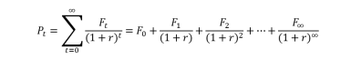 Le prix théorique d’un actif, quel qu’il soit (action, immobilier, infrastructure…) peut être approché par une simple formule : le prix actuel reflète les revenus monétaires futurs, qui sont actualisés pour rapporter ces flux futurs à une base comparable à la période de définition du prix théorique. Mathématiquement, le prix (valorisation) à un instant t est égal à la somme actualisée des revenus futurs (F).