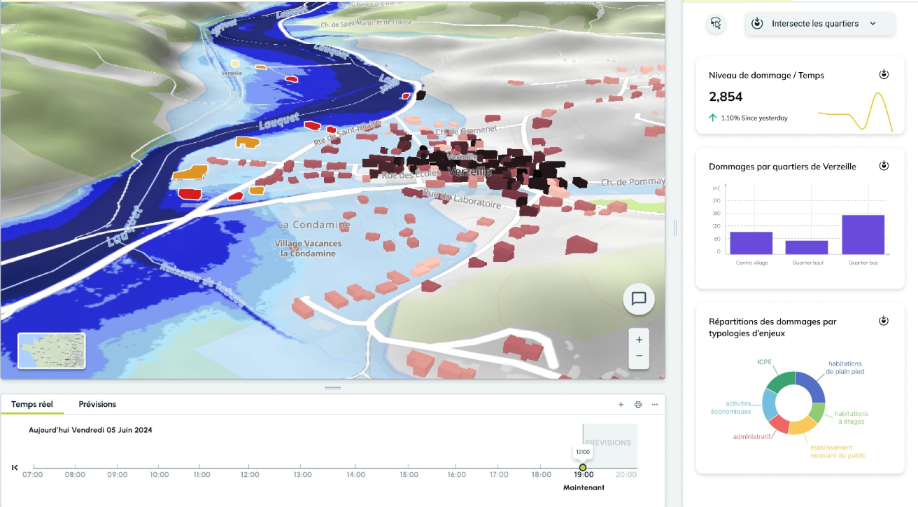 Nous déployons actuellement des expérimentations pour des collectivités dans l’objectif de les aider dans la supervision temps-réel et prévisionnelle des zones inondées pour optimiser la gestion de crise. Cela notamment en identifiant des secteurs impactés et les aidant à anticiper l’évolution de l’événement pour protéger les populations et les biens (évacuations préventives, balisage des routes, gestion de trafic, etc.).
