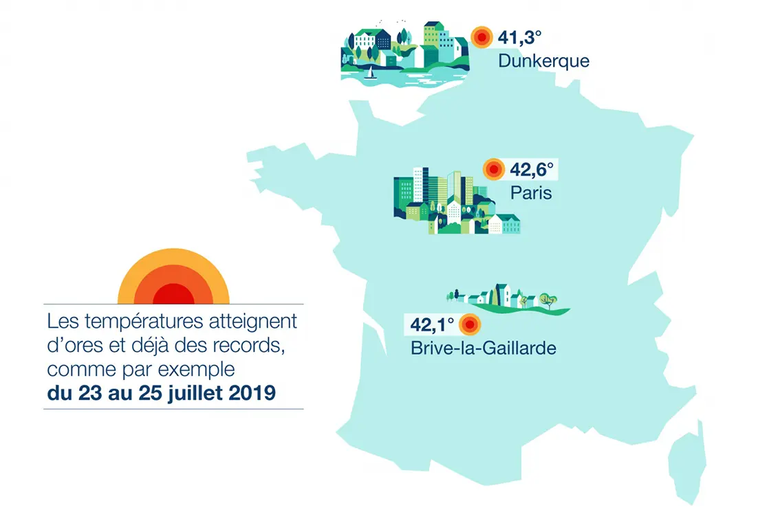 Le climat des villes est plus chaud que celui des espaces naturels environnants : trop de bâtiments, de véhicules polluants, sols trop minéralisés, etc. L’effet d’îlot de chaleur urbain se fait particulièrement sentir lors des épisodes de canicule.