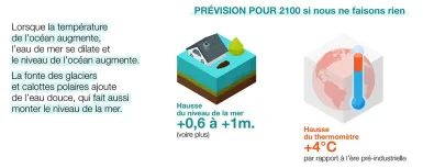 Si la température de la planète continue de se réchauffer, le niveau des mers pourrait s’élever jusqu’à 1 m après 2100 (même si cela pourrait être beaucoup plus car l’incertitude demeure sur l’ampleur des conséquences du changement climatique au-delà d’un certain niveau de réchauffement, d’où des prévisions plus alarmistes allant jusqu’à +4 m en cas de déstabilisation des deux pôles selon la géographe Valérie Morel). Cela pourrait entraîner une surcote énorme et provoquer un risque accru de submersion et définitif dans les zones basses jusqu’à l’arrière-pays littoral. Les océans et les mers jouent en effet un rôle majeur dans la régulation du climat et sa stabilité au niveau de la planète.