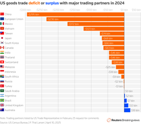 Déficit commercial des États-Unis par pays, données issues de l’U.S. Census Bureau réalisé par Reuters
