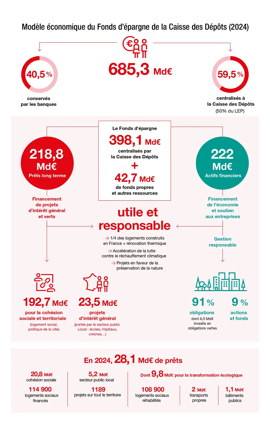 Une partie est transformée en prêts à long terme, de 30 à 80 ans pour financer le logement social, la politique de la ville, mais aussi des projets d’intérêt général comme la redynamisation des centres villes, les réseaux d’eau ou de chaleur, la rénovation thermique de bâtiments publics comme les écoles, les transports propres, les universités ou les hôpitaux. Ces prêts sont proposés aux organismes de logement social et aux collectivités locales par la Banque des Territoires et contribuent tant à la transformation écologique de notre pays qu'à une économie responsable.
